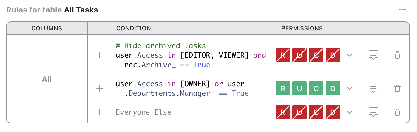Reference user attributes and record data to define conditions with simplified Python syntax.